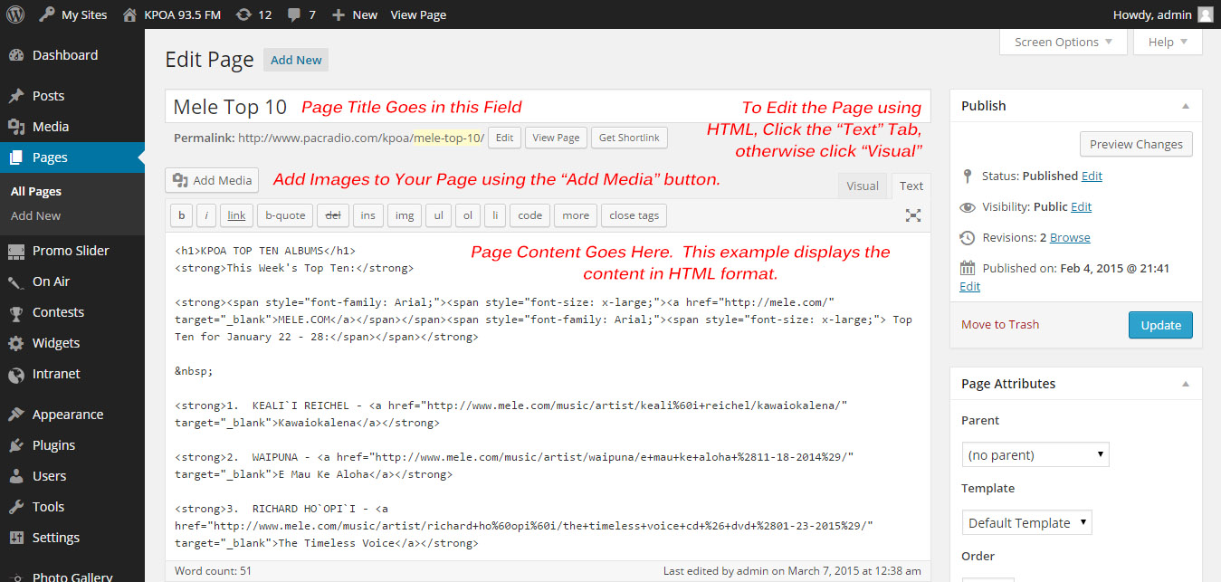 To edit an existing page, login to the Wordpress Dashboard using one of the links at the top of this page.