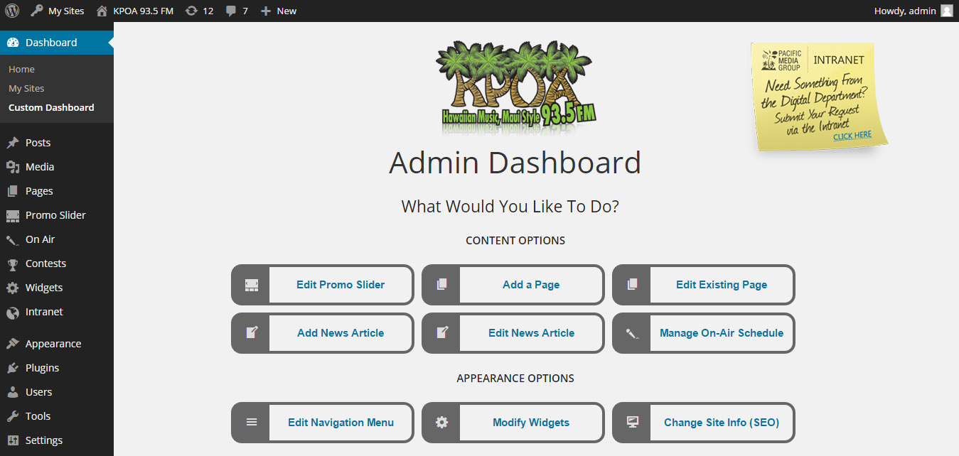 Click the “Dashboard” link on the top of the left menu. This will take you to your administration options.